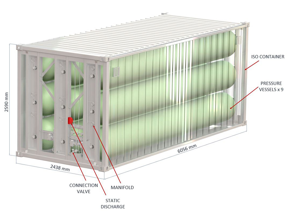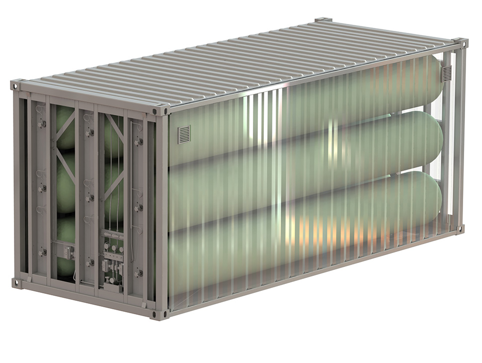 • These are 20-foot standardized containers that can store about 350 kg of Hydrogen at 350 bar in three different pressure banks and can be moved by trucks